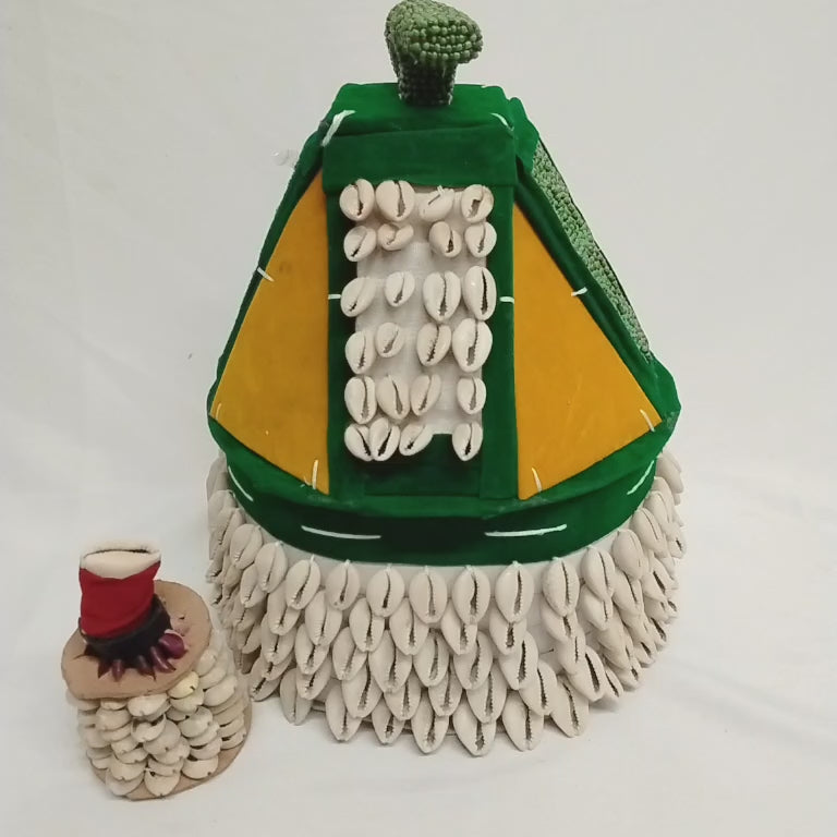 An ile ori is a traditional yoruba religious object and altar,literally meaning " house of the head". These ornament objects are often made from materials like leather,cloth and Cowries shells which symbolizes wealth and cultivate character. It comes in different sizes: 17inches height and 31inches in circumference, 11inches in height and 24inches in circumference